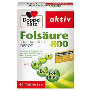 Doppelherz Folsäure 800 DEPOT – Folsäure zur Unterstützung normaler Zellteilung – Zusätzlich mit Vitamin B6, B12, C und E – 1 x 40 Tabletten